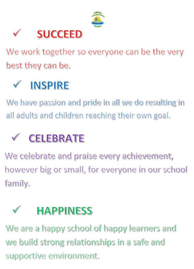 We aim to create a calm and caring school family within a climate of joy, freedom, respect, challenge, co-operation and celebration. We strive to provide opportunities for the development of the whole person, so that as well as succeeding intellectually, each child will also be supported in developing their imagination, creativity, spirituality, emotional, physical and social skills. This is reinforced by maintaining home-school-parish links with the child at its centre.